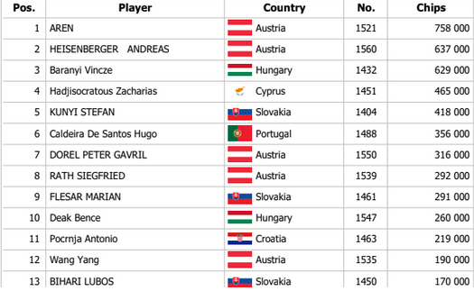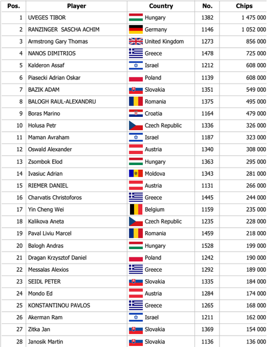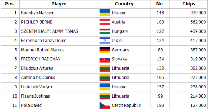 Lischuk otváral na 50,000, Rath dorovnal a Maté poslal za 565,000 z blindov. Lischuk poslal tiež a Rath zahodil. Maté držal Ax Kx, Vadym otočil Ax Jx a po boarde 6x Jx 5x 3x 9x je Janos vyradený.