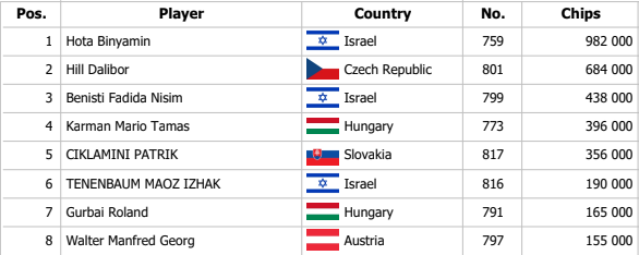 On the turn 8h 5s Js 4d Pinhasi bets 135,000 into a pot of around 300,000 and Maté raises to 400,000. Alon asked couple of questions but Maté didn´t answered. After longer while Pinhasi folded face up Jx and Sándor with unecessary punch and explosion of joy shows only Ax Kx.