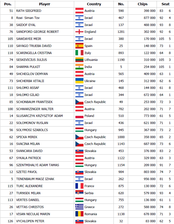 Avraham sa dostal do all inu za svojich 148,000 a dorovnali Klein a Žikavský. Board 6s 3h 7x 8x Qx aktívni hráči precheckovali a Klein otočil Ax Tx, Žikavský Ax Kx a Avraham tento pot berie so setom sedmičiek.