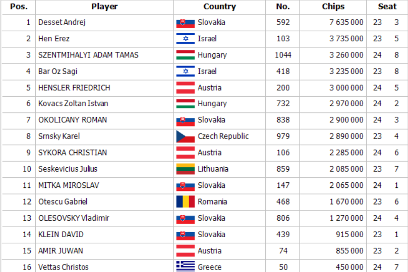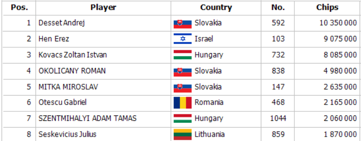 Openraise na 260,000 od Seskeviciusa dorovnal Otescu na buttone a Okoličány poslal za 2,230,000. Christian Sykora držal o troška menej na bb a dorovnal, Seskevicius okamžite zahodil, Otescu si vypýtal count ale zahodil tiež. Roman otočil deviatky a Christian Kx Kx. Board 9x 2x 5x 6x Ax poslal Christiana s hnusným badbeatom na kasu a zostávajúcich osem hráčov sa presúva na streamovaný finálový stôl !