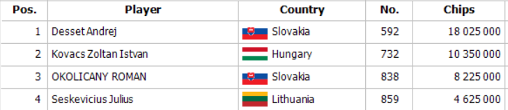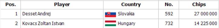 Roman otvoril na 900,000 zo sb a Desset dorovnal z bb. Flop 9h Qh 6h priniesol od Romana push za 7,400,000 a Andrej okamžite dorovnal s Th 3h. Roman držal Ks Kd a po turne 2h a rivri Qs Roman končí na treťom mieste a ideme hrať headsup !