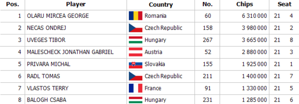 Aage Rakvaag sa dostal do preflop all inu za 920,000 s Tx Tx proti Qc 9c súpera. Po boarde 5x 5x 6x Qx 2x vypadáva na desiatom mieste. Na druhom stole posledných 290,000 dostal za čiaru Rudolf Schaumuller s Jx Tx proti 9x 6x ktoré držal Nečas. Po boarde Kx 8x 6x 7x 5x tak na FT pokračuje osmička hráčov.