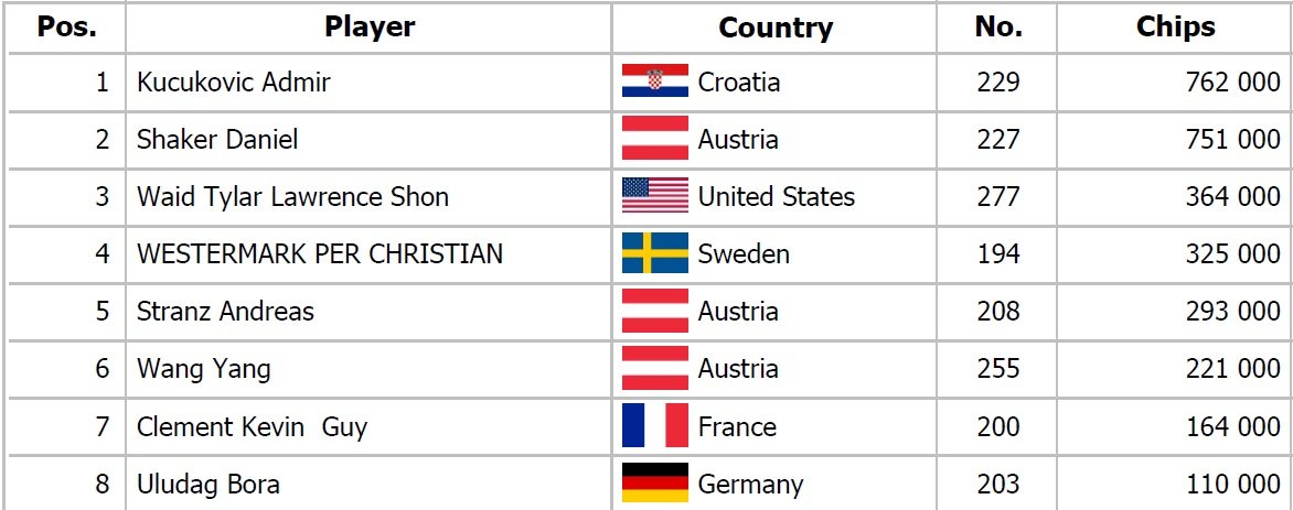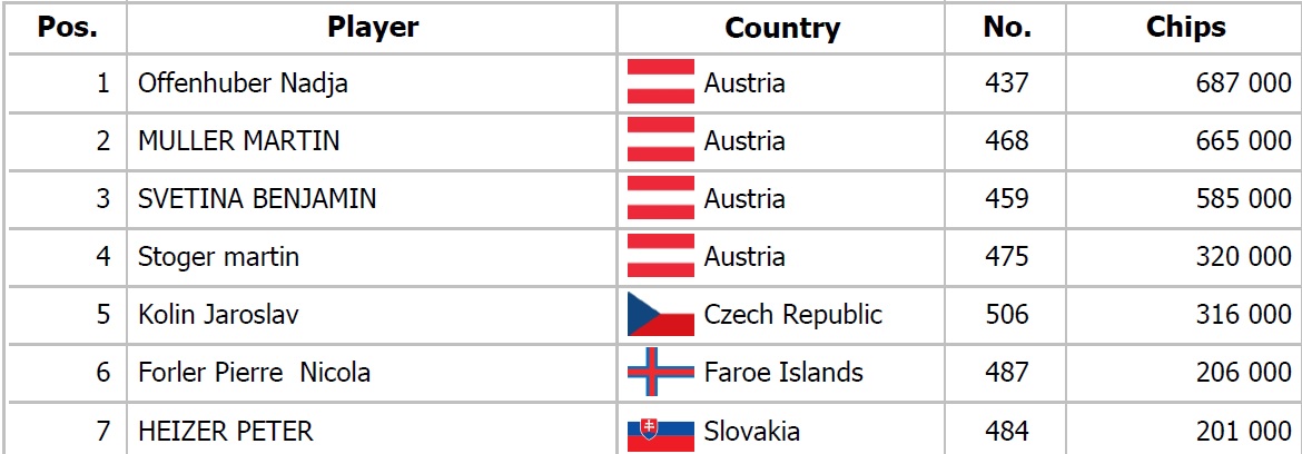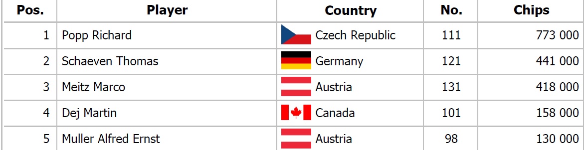 Hierzer sa dostal do preflop all inu s Qc Tc proti deviatkam u Schnierera. Po boarde 2x 7x Ax Kx Kx tak Daniel končí po veľmi krátkom headsupe.