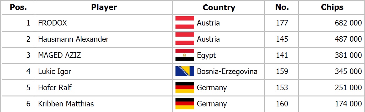 Frodox poslal do hry posledných 125,000 so sedmičkami a dorovnali dvaja súperi. Na flope Kd Qd 3c posielal Marco Meitz all in asi 350,000, no posledný hráč v hre zahodil. Frodox otočil sedmičky, Marco Ad Td. Po turne 7x a rivri Ax však jeho monsterdraw nedoskákala a Ati tak prežíva.