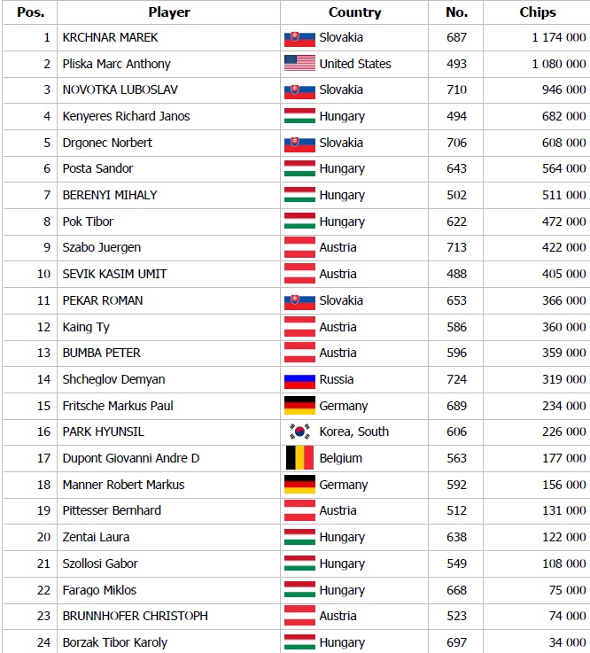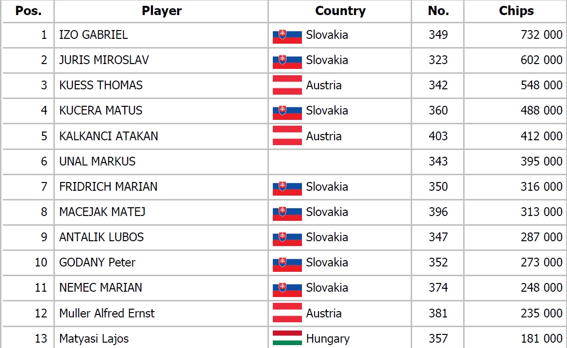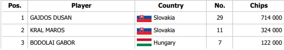 Na stole číslo štrnásť Zdenko Viglašský poslal all in asi 950,000 do potu 600,000 na rivri Kx 6s Qx 5x Jx. Jeho súperovi sa to síce nepáčilo ale so setom koní dorovnal. Viglašský otočil set šestiek a Day 2 tak ukončujeme pekným setupom. V tej istej chvíli zaznel all in od Bluhma za 980,000 z Ep s Ax Kx a zahraničný hráč na bb si našiel Qx Qx. Posledným boardom večera bol 3x 3x Jx 8x 4x a zajtra nás tak čaká posledných 15 hráčov.