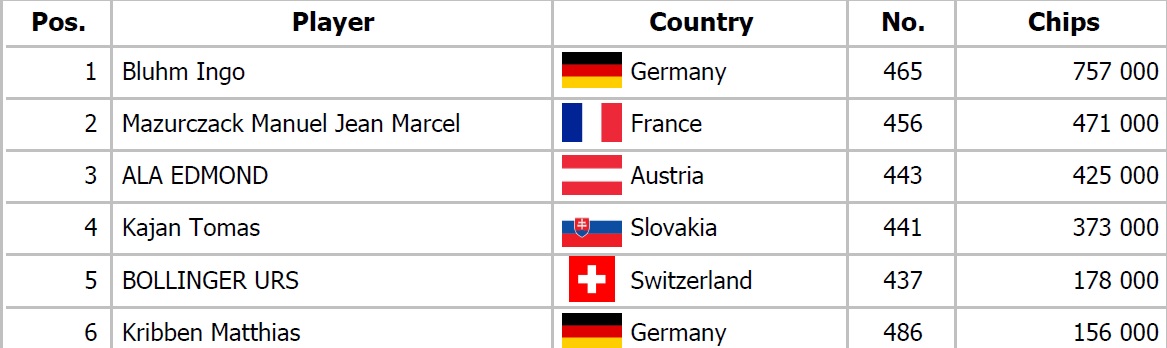 Postup do Day 2: Všetci postupujúci do Day 2 získajú hneď buy-in späť (100€)
