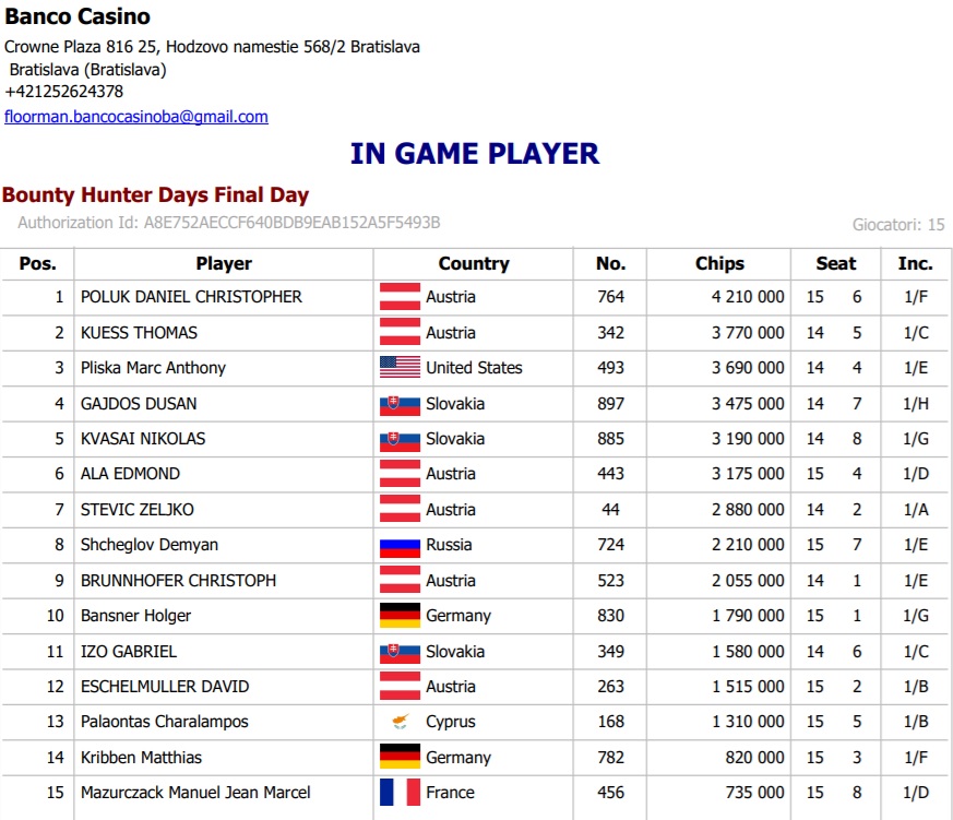 Druhý hrací deň Bounty Hunter Days priniesol množstvo šialených zohrávok a napínavej akcie a nakoniec sme spoznali 15 postupujúcich. Najlepšie sa darilo Danielovi Polukovi so stackom 4,210,000. Ostatné stacky nájdete pod príspevkom a turnaj bude pokračovať zajtra od 16:00. Od zloženia finálového stola pobeži aj livestream, ktorý môžete sledovať na linku nižšie. Taktiež je pre Vás pripravený daily turnaj BHD Monday Knockout s buy inom 45€ a garanciou 3,000€.