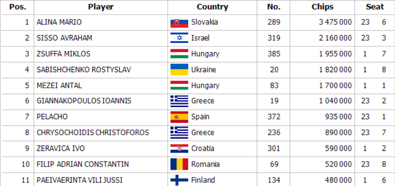 Lukáš z Ep posunul za čiaru takmer 300,000 a Paivarinta dorovnal. Antal Mezei však rejamol 940,000 a Paivarinta zahodil. Stopka otočil Kd Th a Antal Ah Kc. Po boarde 6s 9s Ac 5d Qx Lukáš nedobrovoľne v turnaji končí.