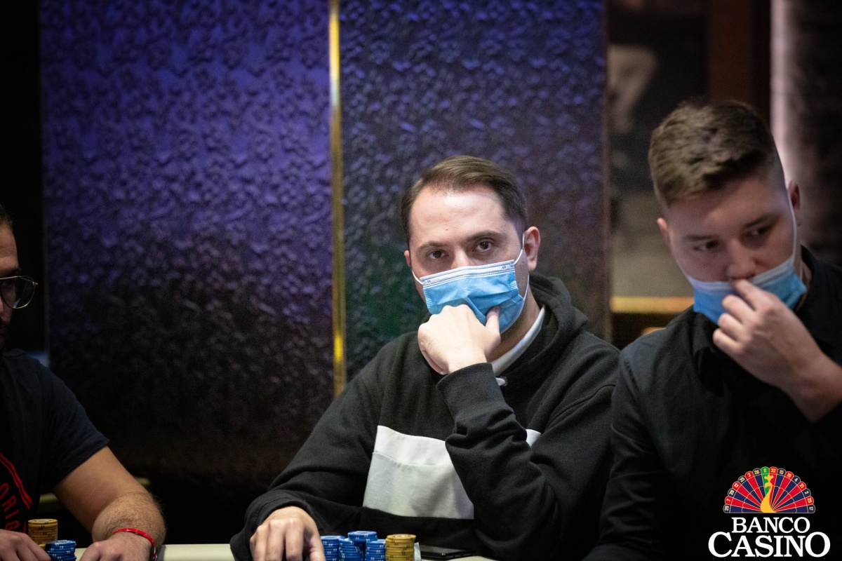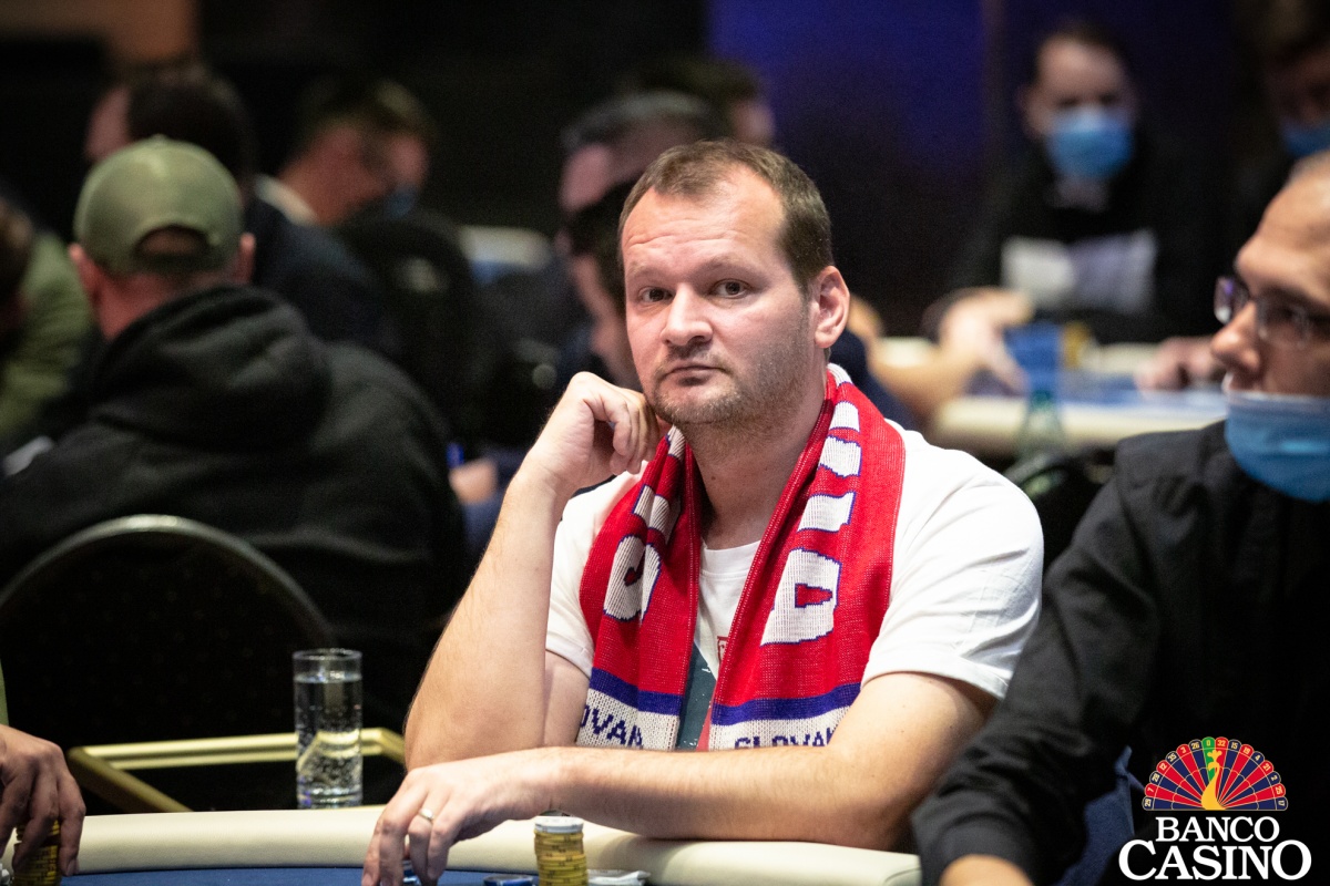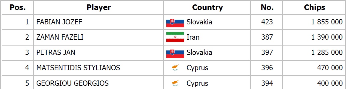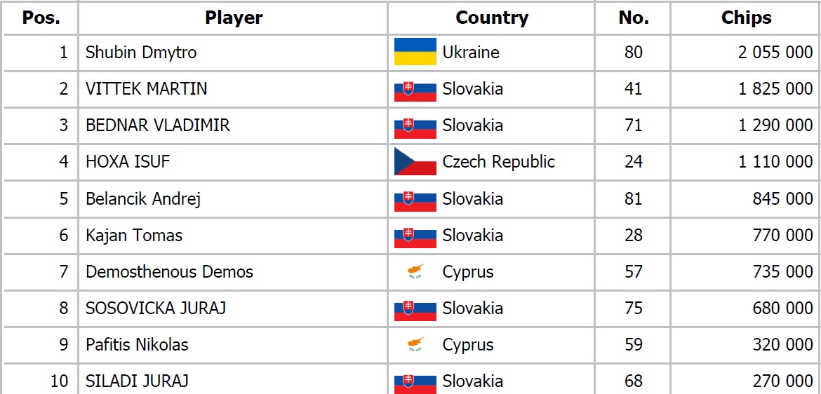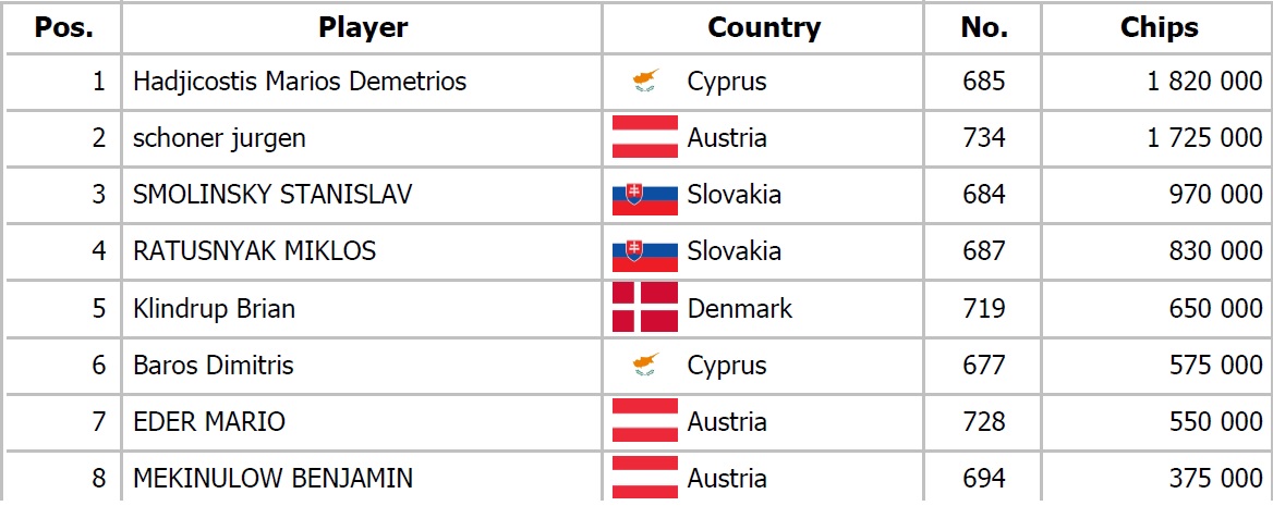 Andrej Belančík a Petros Theodosiou sa dostali do preflop all inu za ich asi 1,500,000 proti Jurgenovi Schonerovi, ktorý oboch pokrýval. Belančík držal osmičky, Petros Qx Qx a Jurgen Ax Kx. Po boarde Ax 5x Jx Tx Qx tak vidíme double seat open a od konca hracieho dňa nás delia iba dve eliminácie.