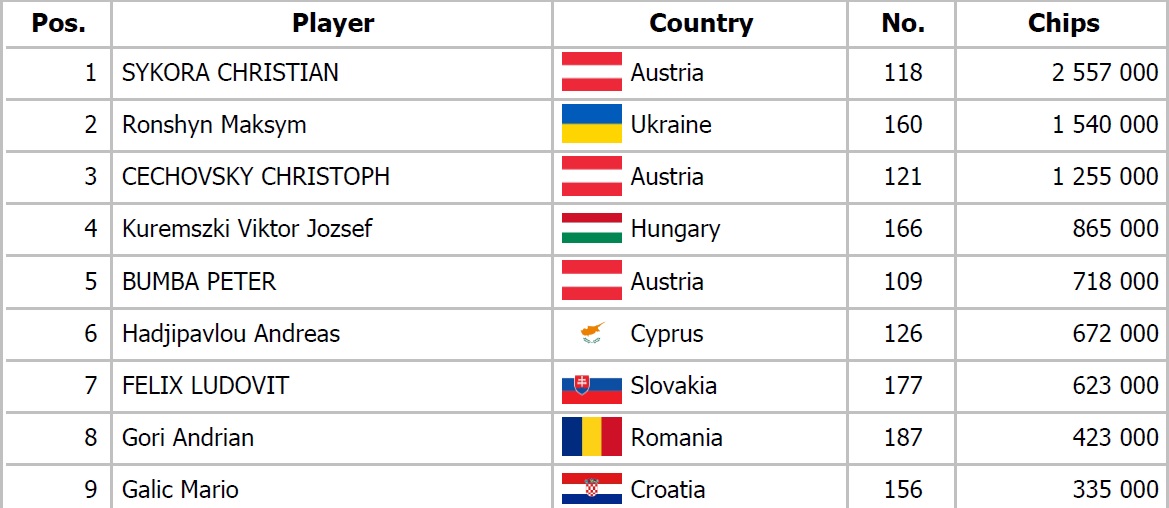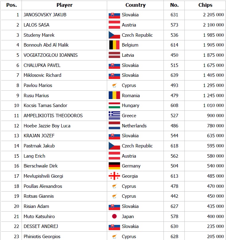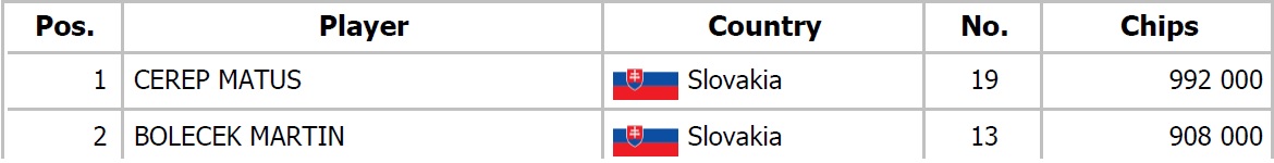Po náročnom Day 2 sme spoznali 16 postupujúcich do zajtrajšieho Final Day. Chipleadrom sa po niekoľkých vydarených hrách stal Jurgen Schoner, ktorý si zabalil 12,790,000 a v tesnom závese za ním je domáci Jakub Jánošovský so stackom 12,325,000. Final Day sa začne zajtra o 16:00 a po zložení finálového stola sa spustí aj Live Stream, ktorý nájdete na linku nižšie. Zajtra je pre Vás pripravený aj The Hendon Mob Farewell Turbo Deepstack s buy inom 35€ a štartom o 19:00. Tešíme sa na Vás !
