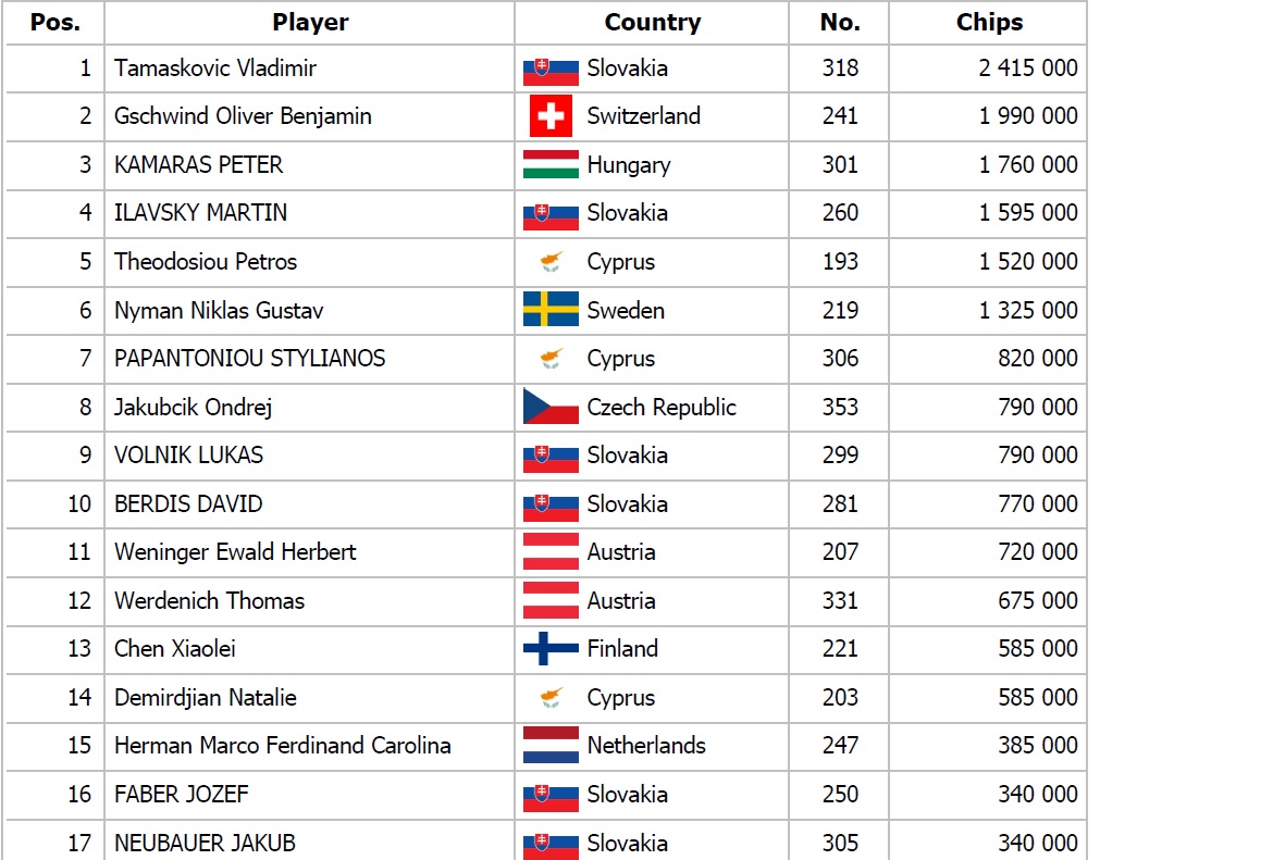 Na turne 5h 8s 7h 6d je v pote asi 1,500,000 a približne toľko efektívne Andrian posiela za čiaru. Georgiou Georgios premýšľa dlhé tri minúty,než karty zahodí. Niekoľko hier na to sa Georgios z turnaja zberá na kasu. Súbežne s ním odchádza na kasu aj Vlado Tamaškovič.