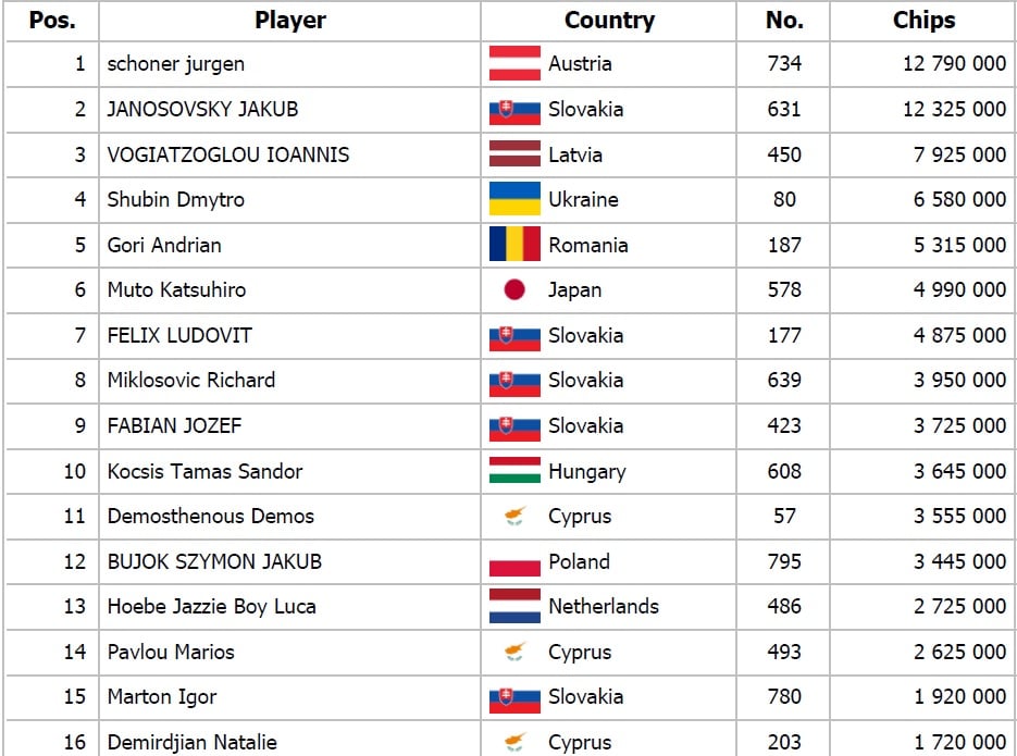 Po niekoľkých vydarených hrách sa Dmytro dostal na river Kd Ts 5h 3c 2c a v pote bolo 21,000,000. Jakub betol 14,000,000 a Dmytro poslal 30,000,000. Jakub sa po dlhom premýšľaní rozhodol dorovnať s Tx 2x, avšak Dmytro držal set 5x 5x. Jakub si tak  odnáša  22,795€.