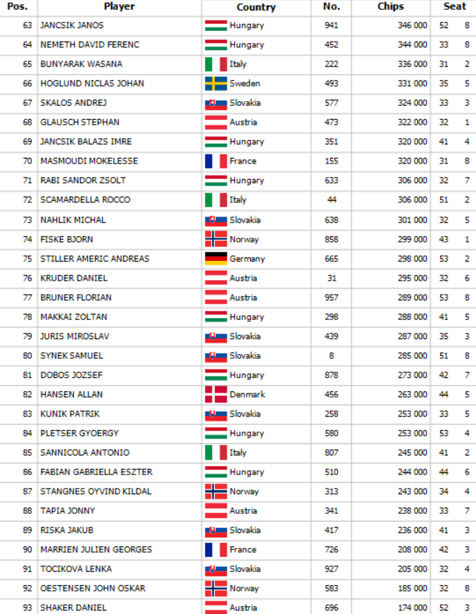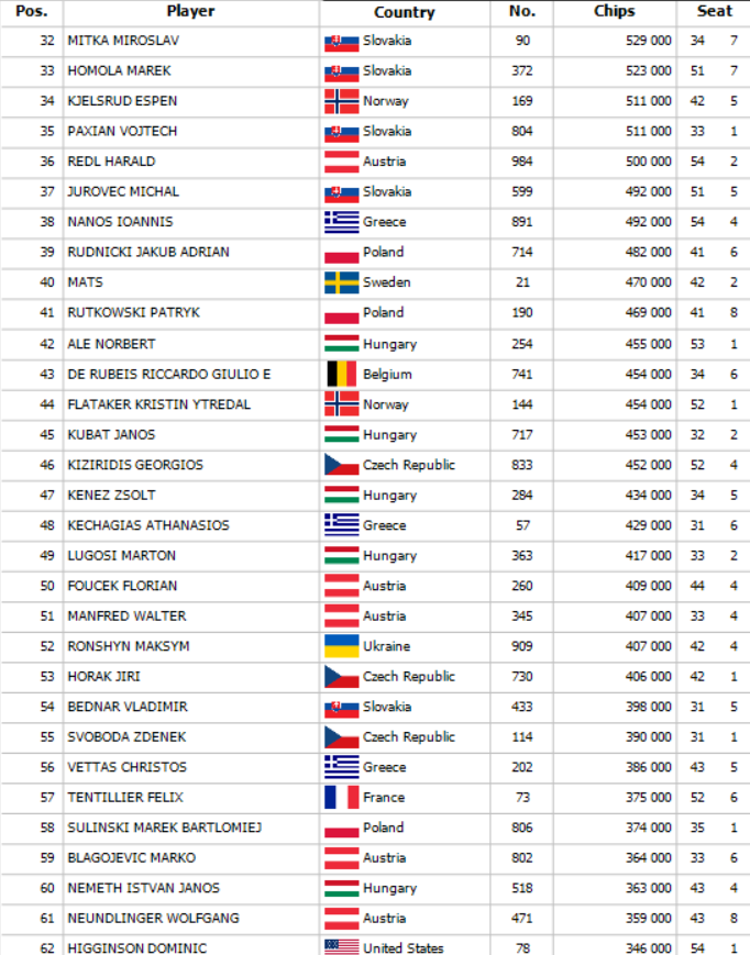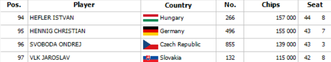 Espen otváral na 35,000 a Svein za ním sa rozhodol pre 3-bet na 75,000. Gyoergy dorovnal a Espen sa chcel na flop pozrieť tiež. Na flope Ks 2s 3s Svein pokračoval za 100,000 a dorovnal iba Gyoergy. Na turne Th Svein vsadil ďalších 150,000 a Gyoergy po prerátaní svojho stacku a niekoľkonásobnej kontrole kariet zahodil.