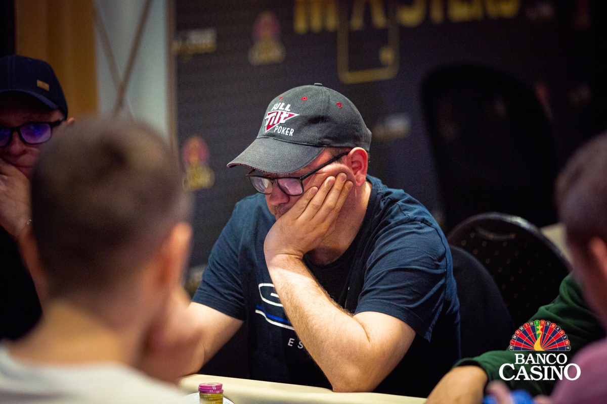 Maciej sa dostal do preflop all inu za svojich 39,000 s Ax Jx proti Christosovi Tsoukasovi s Ax Kx. Nešťastný runout Qx 9x 2x 9x Jx však na rivri prisúdil pot poľskému hráčovi.