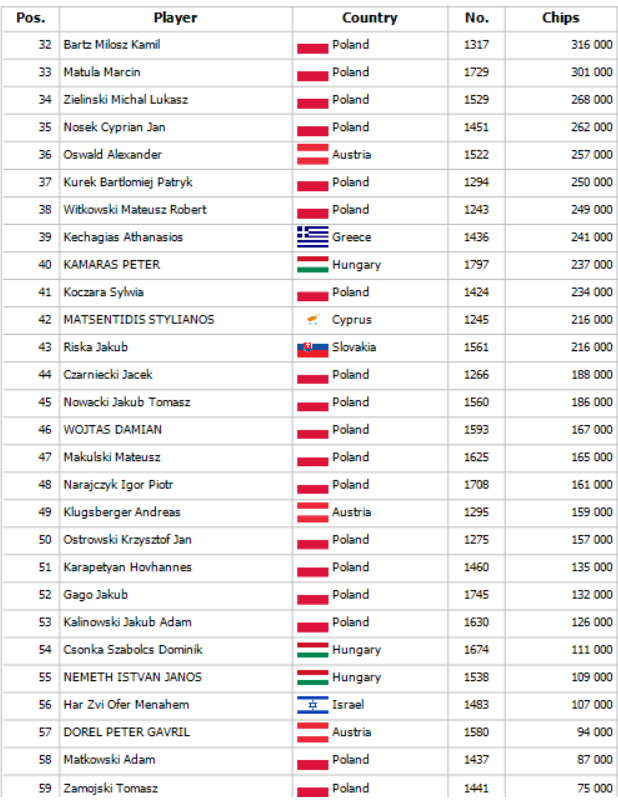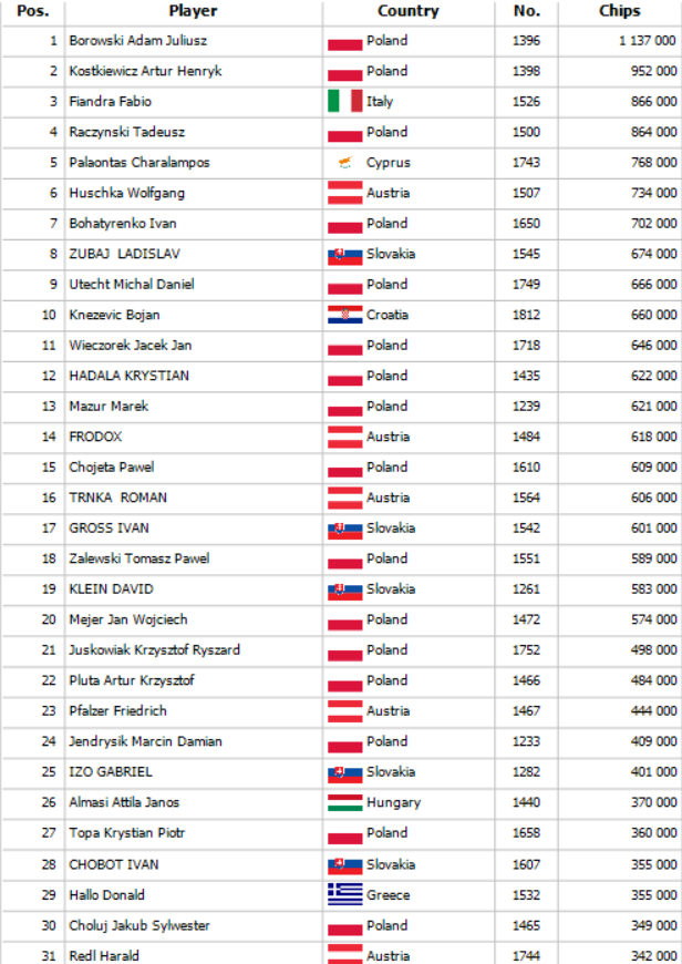 Hra sa v posledných minútach trocha zaťahuje ale podarilo sa mi zachytiť dva krásne flipy. Grzegorz dostal stack za čiaru s Ax Qx iba nato, aby nabúral do jackov maďarského súpera. Blank board podržal nižší stack. Vedľajší stôl priniesol all in asi 150,000 od Jaroslawa, ktorý s osmičkami ako vyšší stack točil do Ax Qx súpera. River Qx však Jaroslawovi nechal za čiarou posledné dva bigblindy.