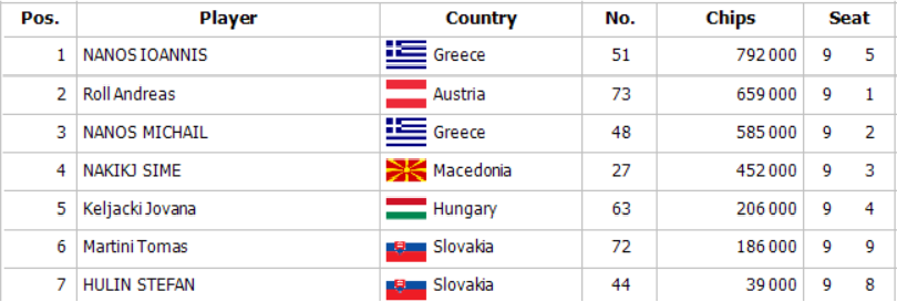 Do flightu 1A Polish Poker Days Main Eventu naskočilo cekom 73 hráčov a tak postupovala skromná sedmička hráčov. Na jej čelo sa postavil Ioannis Nanos, ktorý pozbieral stack vo výške 792,000. Dnes od 18:00 je pre Vás pripravený flight 1B. Tešíme sa na Vás !