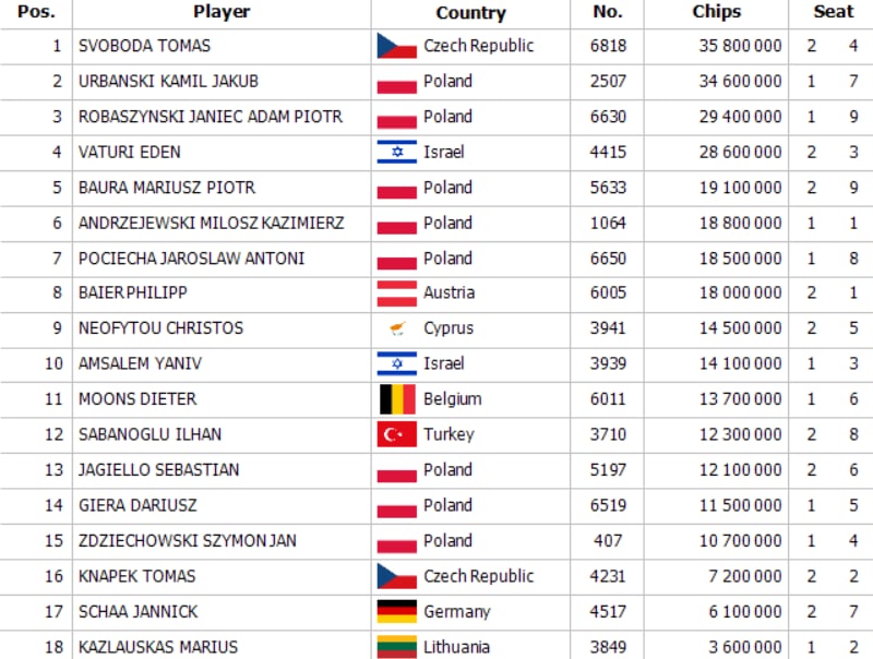 Christoph Rapf sa dostal do preflop all inu za 7bb s Ax 6x a poľský súper dorovnával s Ax Tx. Po blank boarde Rapf tak končí na dvadsiatom druhom mieste za 3,500€. niekoľko minút na to vypadol aj Mathias Grabski, ktorý prehral s 9x 9x proti Svobodovi s Ax Qx. Ernest Rajek posledných asi 6bb prehral s Kx 7x proti Ax Qx rakúskeho súpera.