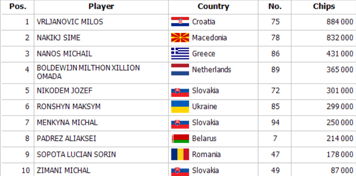 Ido posunul za čiaru jeho 73,000 s Qx Qx a Aliaksei Padrez dorovnal s Qx Jx. Po boarde Ax Tx Kx 2x 8x Ido z turnaja vypadáva a spoznali sme prvú desiatku postupujúcu do day 2.