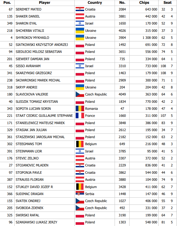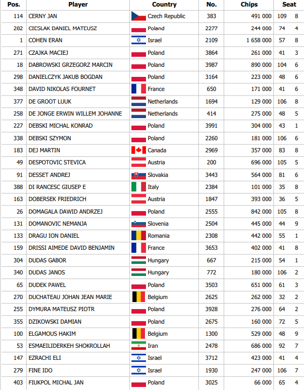 V Main Evente sme na dnes uzavreli day 2 na finálovom stole z pôvodných 406  hráčov.. K svojim stackom sa zajtra vráti deviatka hráčov, ktorú povedie Kajetan Renke so stackom 27,800,000. Celkom do turnaja naskočilo 4,093 hráčov a prizepool sa tak vyšplhal na gigantických 452,275€. Pre víťaza je pripravených 77,345€ a jeho meno sa dozvieme už dnes. Final Day sa začne od 14:00 a je pre Vás pripravený aj stream. Od 18:00 sa začína PPC Farewell Turbo Deepstack 3,000€ GTD s buy inom 50€. Tešíme sa na Vás !