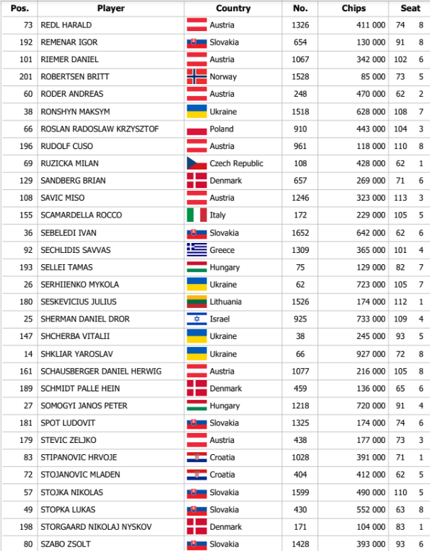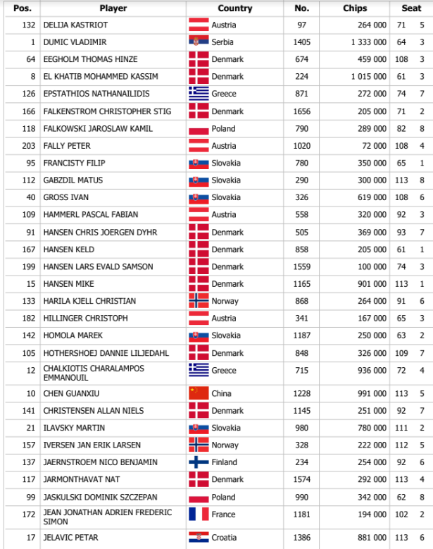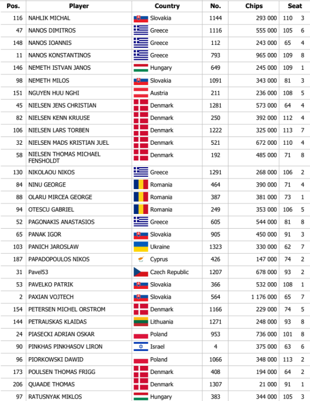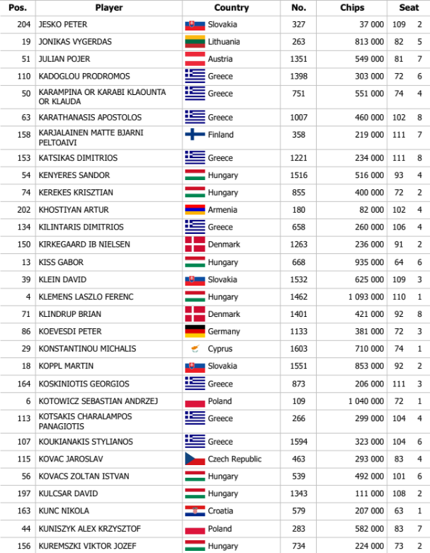 Stylianos sa tentokrát dostal do preflop all inu so sedmičkami proti Qx Qx, ktoré našiel Kastriot Delija. Po boarde 6x 4x 9x Ax 3x si tak Delija berie predošlú stratu nazad a na ultrashort padá Stylianos.