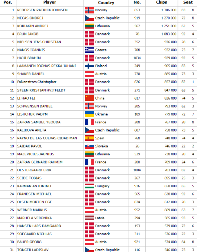 Olsen natlačil za čiaru svojich 280,000 s Kx Jx a nabehol do Ax Qx ktoré našiel Stig Horup. Po boarde 9x 6x 3x 4x 3x už nebolo pre Olsena pomoci a z turnaja vypadol.