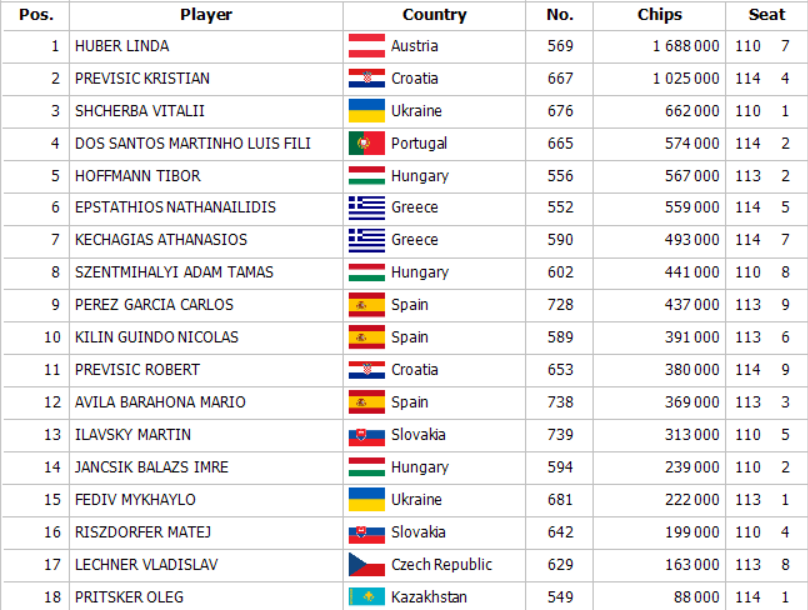 Do flightu 1F sa zapojilo 176 hráčov a miesto v zajtrajšom day 2 si vybojovalo 18 z nich. Najlepší stack vo výške 1,688,000 dnes nazbierala Linda Huber. V týchto chvíľach nad turnajom vysí overlay 52,000€ a bežia ešte nasledujúce flighty : Flight 1G začal o 17:00 a neskorú registráciu uzavrie o polnoci, flight 1H – Turbo sa začal o 22:00 a jeho neskorá registrácia sa zatvorí o 1:40. Poslednou možnosťou postupu do day 2 bude ranný flight 1I – Hyperturbo, ktoré sa začína o 10:00. Day 2 sa začne o 16:00 a všetci postupujúci hráči už majú istotu ITM. Tešíme sa na Vás !