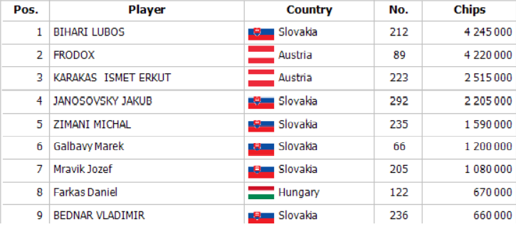 Zimáni dostal svojich 1,095,000 do hry s Qc 5c a Mravík držal šestky. Board 9d 7c 2c 2d Tc nechal Dodovi posledných 190,000, ktoré putovali do hry s 3d 4d na sb proti Lokšovi s Ax Jx. Board Ax Jx Qx 6x Jx bol pre Doda posledným.