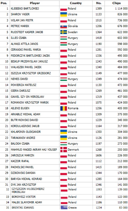 Yaser Sharov otváral na 6,500, Rembialkowski dorovnal a Mikolajczak 3-betoval na 23,000. Sharov odpovedal 4-betom na 50,000, Rembialkowski okamžite zahodil a Mikolajczak chvíľku tankoval. Nakoniec sa rozhodol karty zahodiť a za čiarou mu zostalo 75,000.