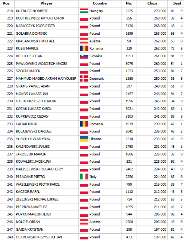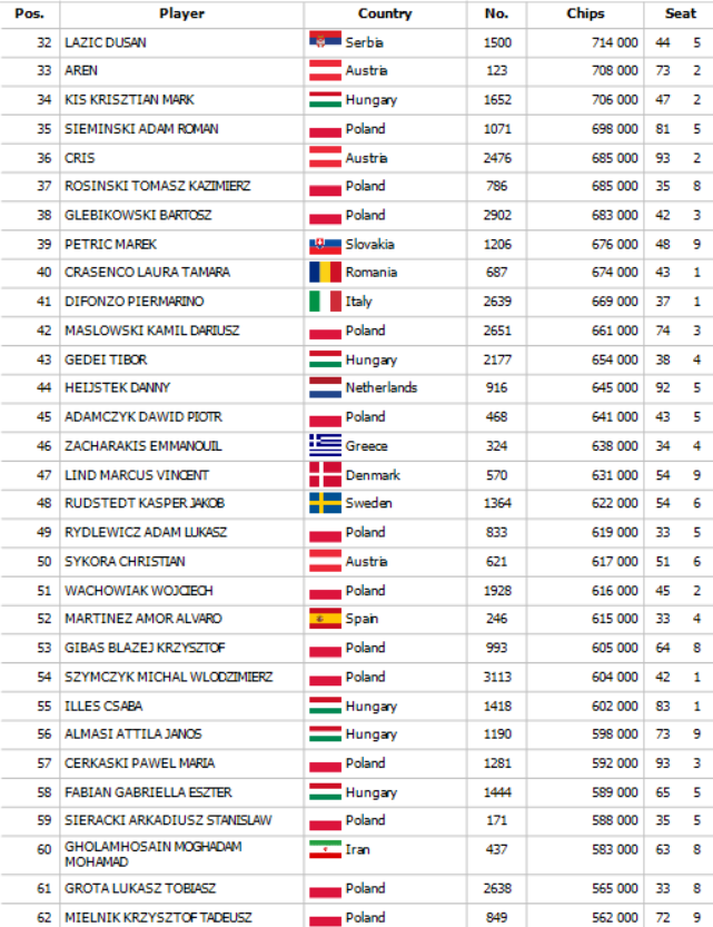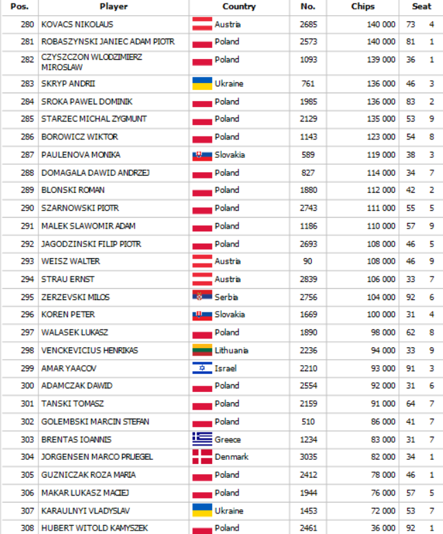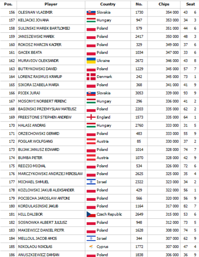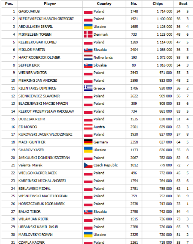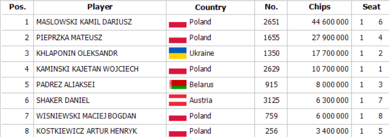 Na začiatku Day 2 SPPC Main Eventu sa zišlo 308 postupujúcich a toto pole sa okresalo po dlhých hodinách na finálovú osmičku. Po ťažkom dni plnom nielen pokrovej akcie ako chipleader na finálový stôl zajtra nastúpi Kamil Maslowski so stackom 44,600,000 a dozvieme sa, kto si odnesie najväčší podiel z prizepoolu 345,975€. Pre víťaza je určených veľmi šťavnatých 56,224€ a finálový stôl bude streamovaný. Od 18:00 je pre Vás pripravený SPPC Farewell Turbo Deepstack s buy inom 50€. Tešíme sa na Vás !