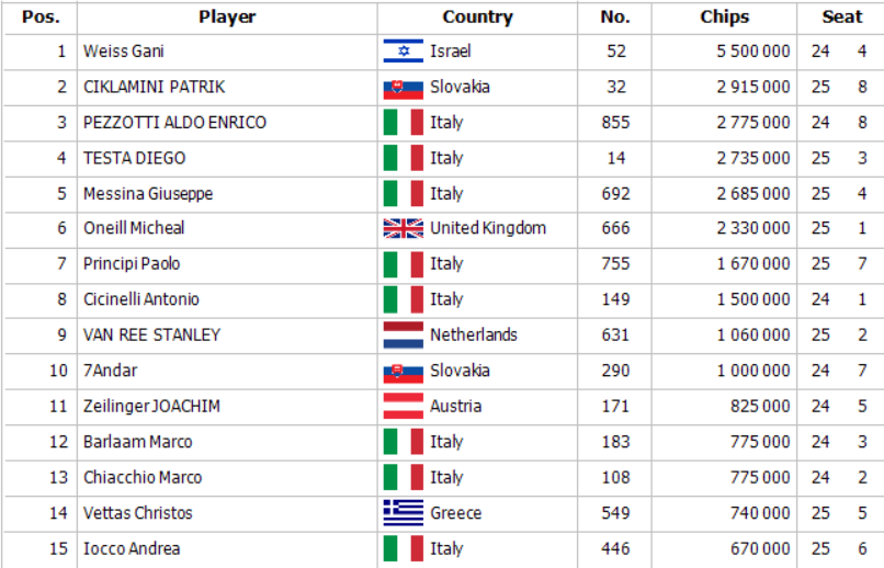 Paolo Principi otváral na 100,000 a Ciklamíni 3-betoval na 300,000. Paolo dorovnal ale na flop 8d 2d 5d Ciklamíni betoval 150,000 a Paolo okamžite zahodil. Z vedľajšieho stola stihol vypadnúť Eugenio Cupellini.