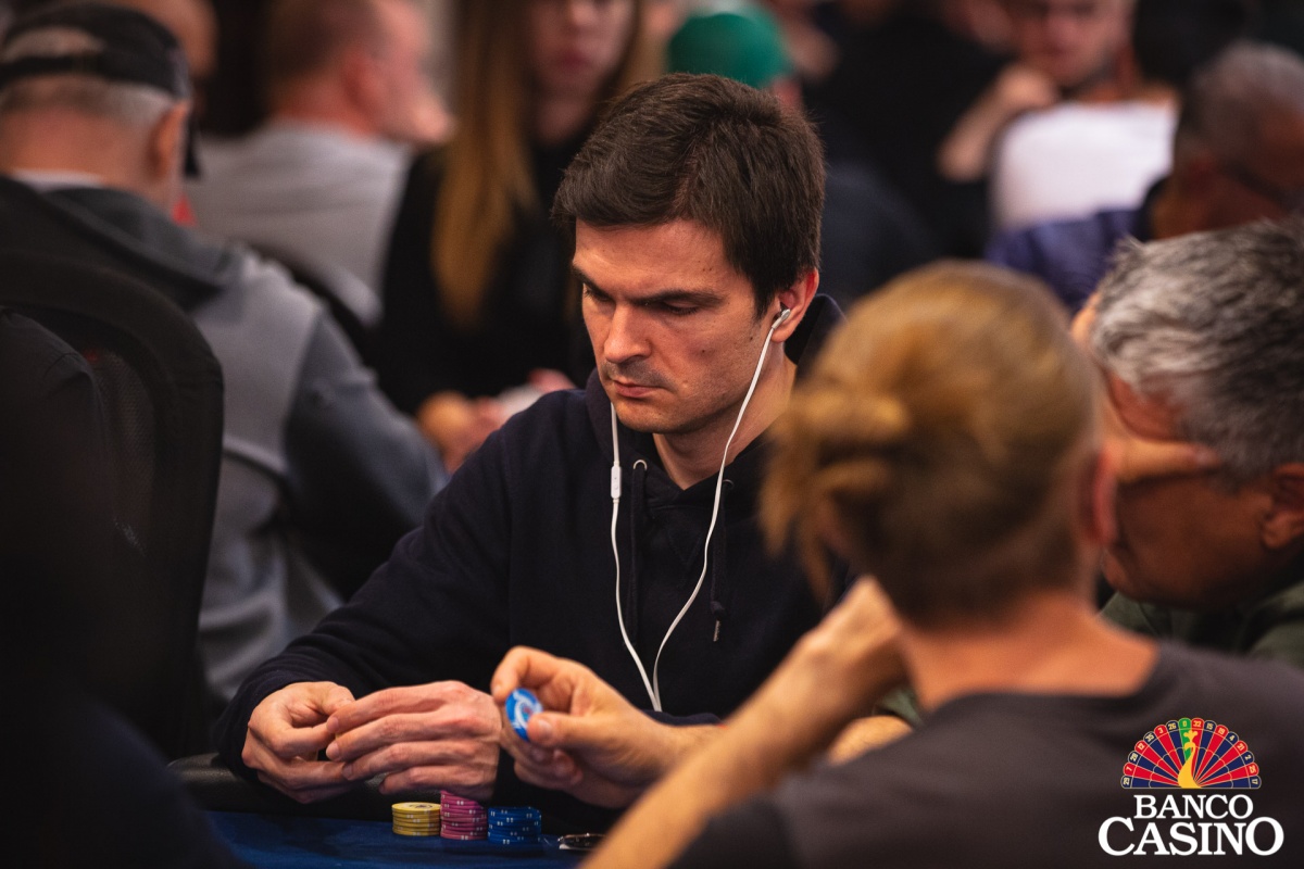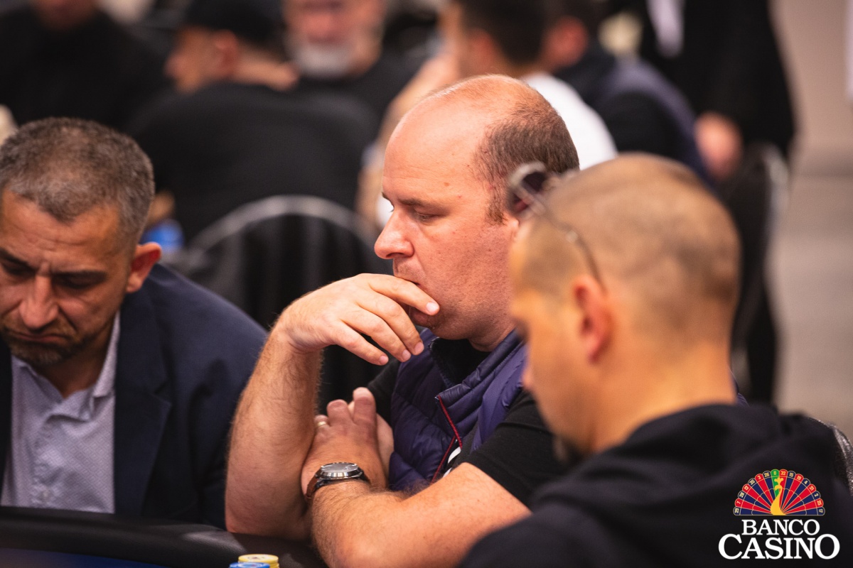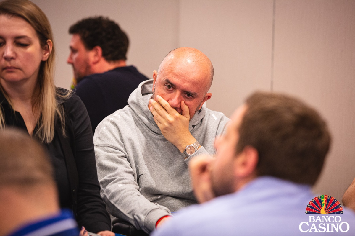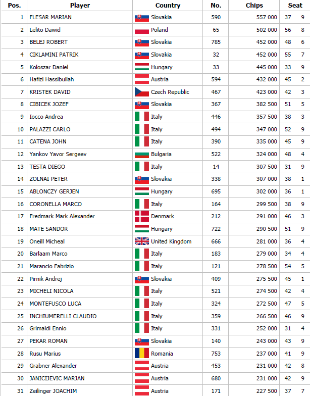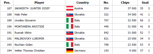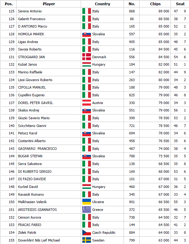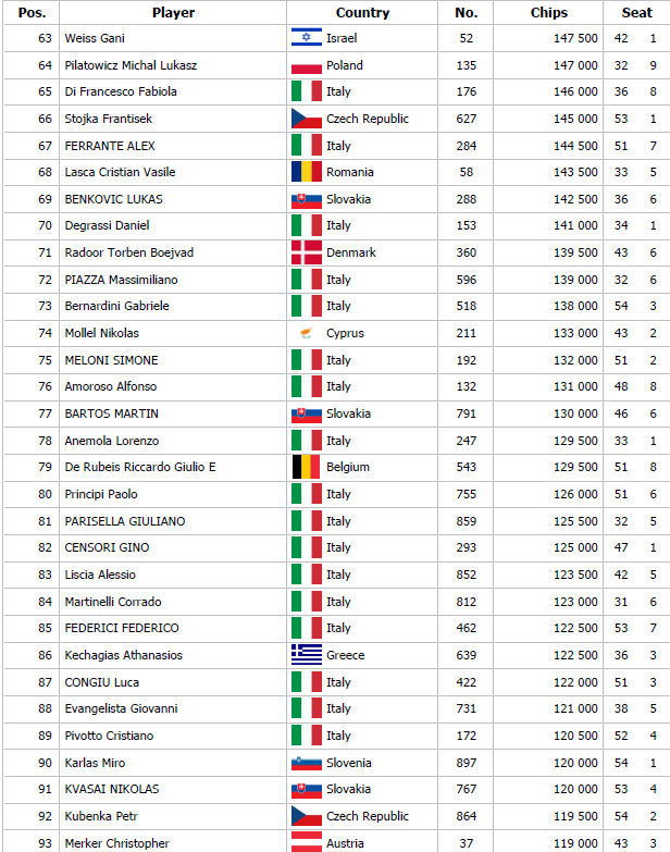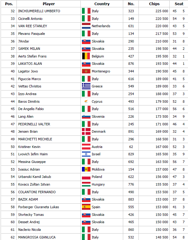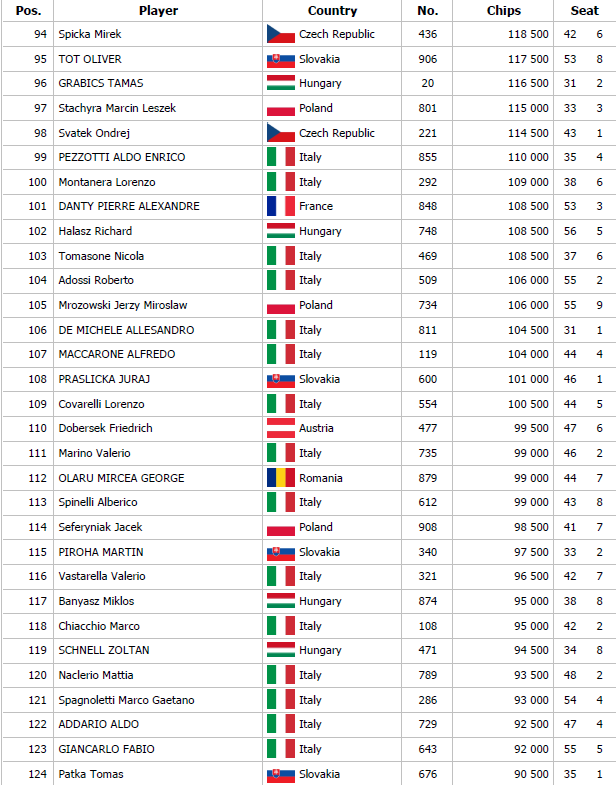 Na stole 42 Nicola Micheli poslal za 142,000 z Ep s Jx Jx a David Křístek na bb si našiel Kx Kx. Board 7x 7x 4x 5x 6x Nicolovi nepomohol a v turnaji skončil. Na stole číslo 44 Mircea Olaru dostal do hry asi 100,000 s Ax 9x a Claudio Inchiumerelli si našiel Ax Kx. Board Qx Tx 2x Qx 4x znova shortovi nepomohol a presúvame sa ITM !