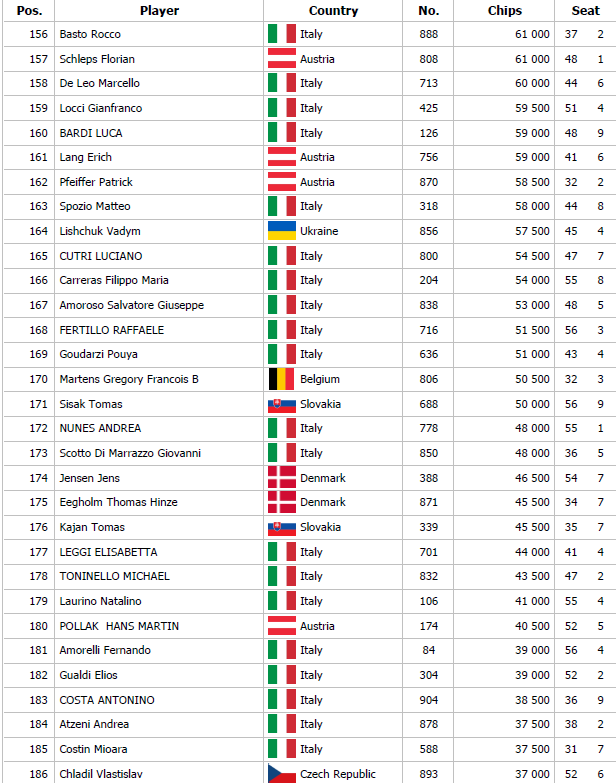 Day 2 Tana delle Tigri Main Eventu priniesol veľa akcie a po dvanástich leveloch sa do Final Day prebojovalo 15 hráčov. Najlepší stack si zabalil Gani Weiss a pozbieral od súperov 5,500,000. Final Day začína o 14:00, o 16:00 TdT Masters s garanciou 20,000€ a buy inom 500€ otvorí svoje brány a o šiestej večer sa začne Mystery Bounty 10,000€ GTD a buy inom 110€. Tešíme sa na Vás !