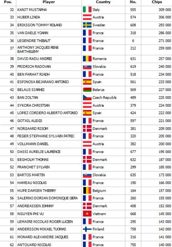 Hráč na Ep otváal na 16,000, Palain 3-betoval na 52,000 a Riego pushoval 111,000 s Kx Kx. Palain dorovnal s Qx Qx a po boarde 3x 7x Jx Qx 3x Riego tak turnaj opúšťa ako bubbleboy.